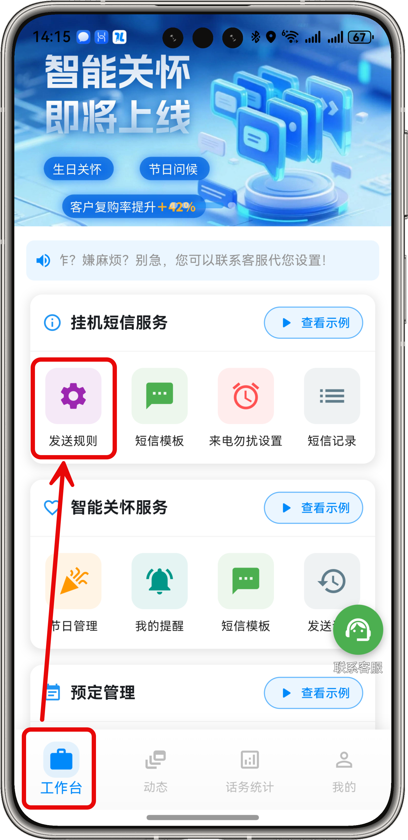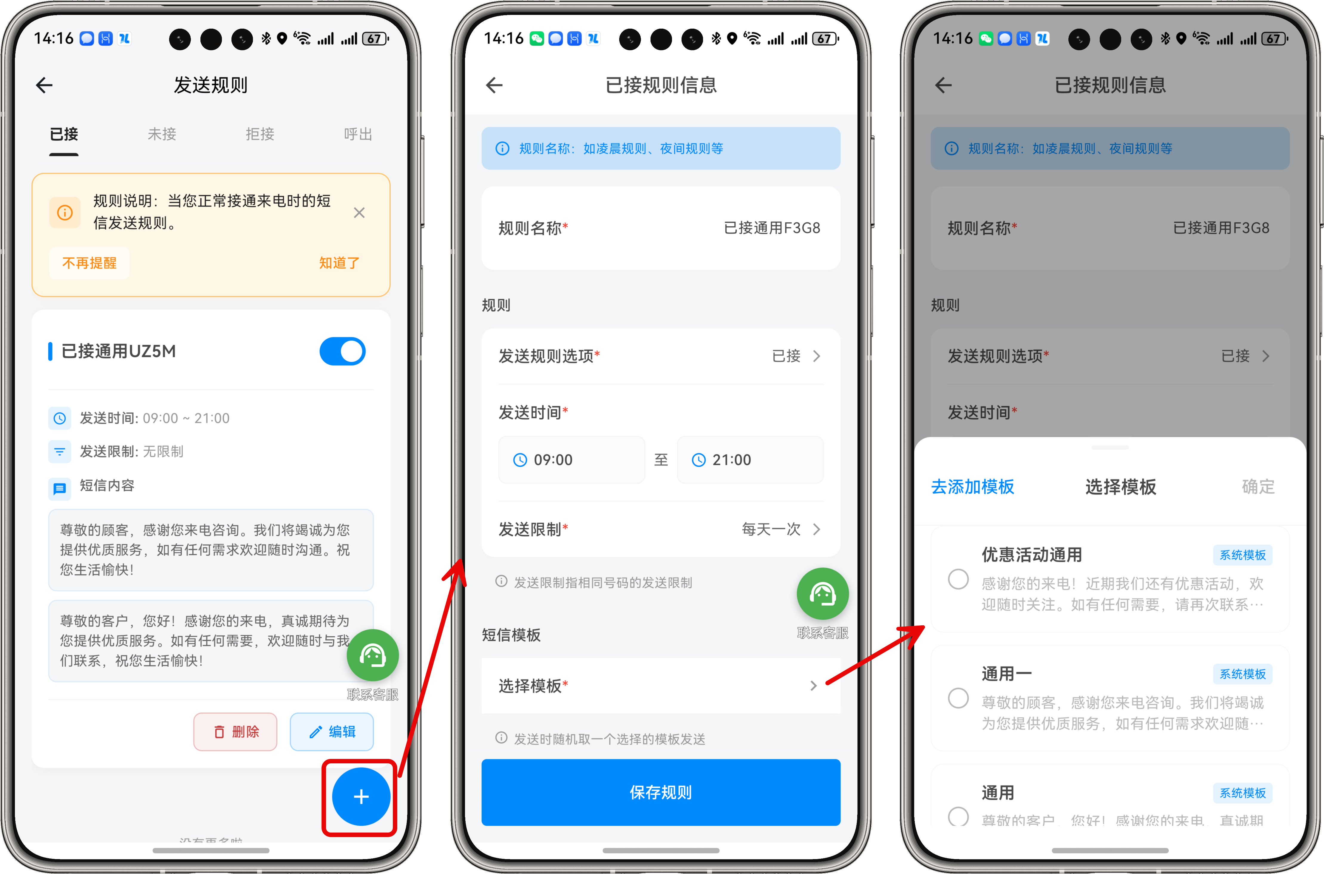 挂机短信服务发送规则按通话状态本页总览按通话状态规则设置入口 通话状态解释 参看这里 添加规则 点击右下角的 “+” 号即可进入规则添加页面,按页面要求依次录入即可。(四种类型方法相同,可分别设置) 注意 多个规则的时间段不能交错,如已经存在 8:00~12:00 的规则,则不能添加 11:00~14:00 类似的有时间交错的规则。 可以选择多个模板,在发送时会随机发送其中一个。 会员权益 非会员会员每种类型只可添加、开启一种规则无限制,可以添加多个规则规则中只可选择一个短信模板规则中可选择多个短信模板随机发送