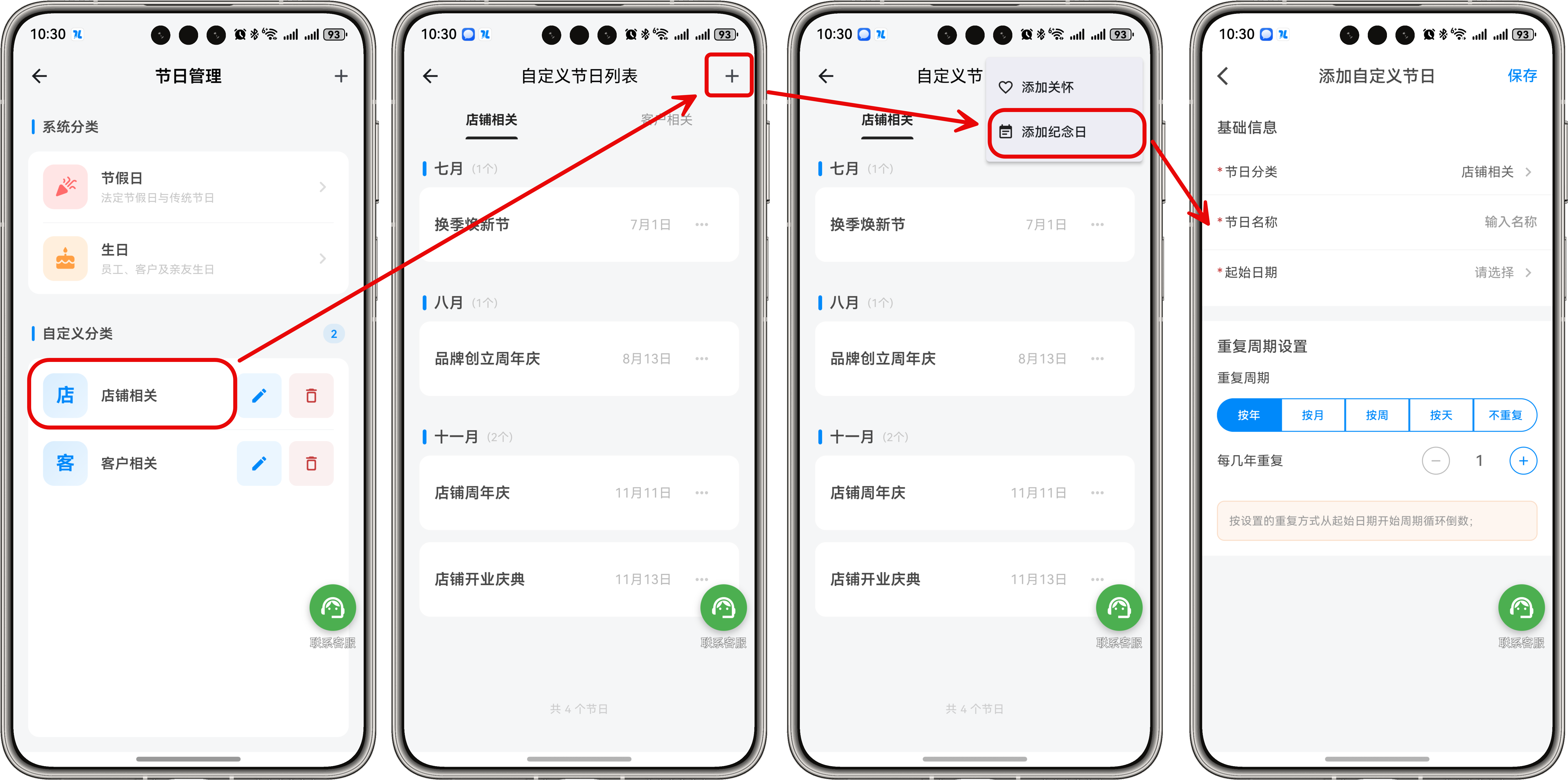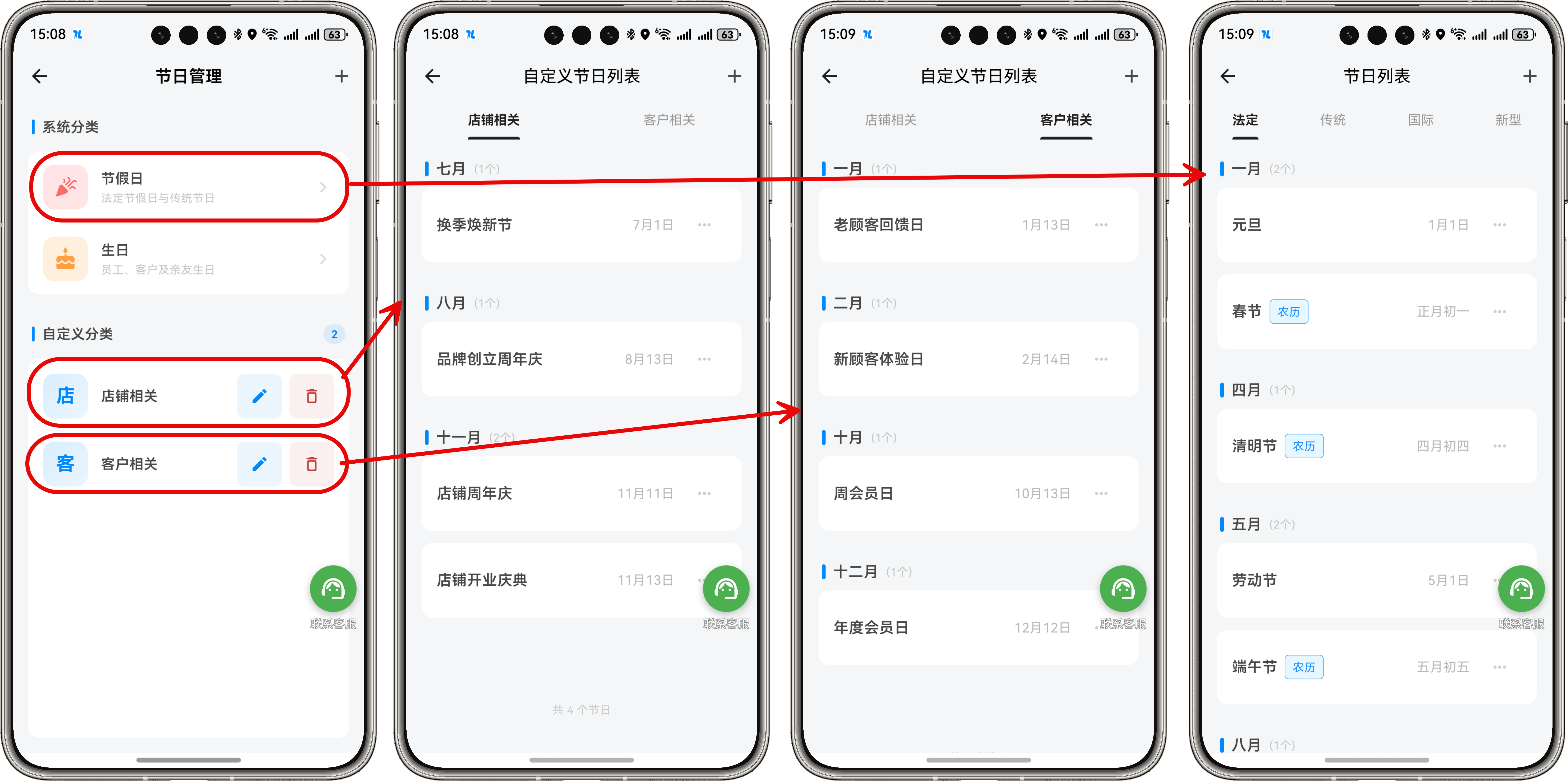 提示- 您可以创建企业/店铺相关的节日分类,以前客户、员工相关的节日分类。