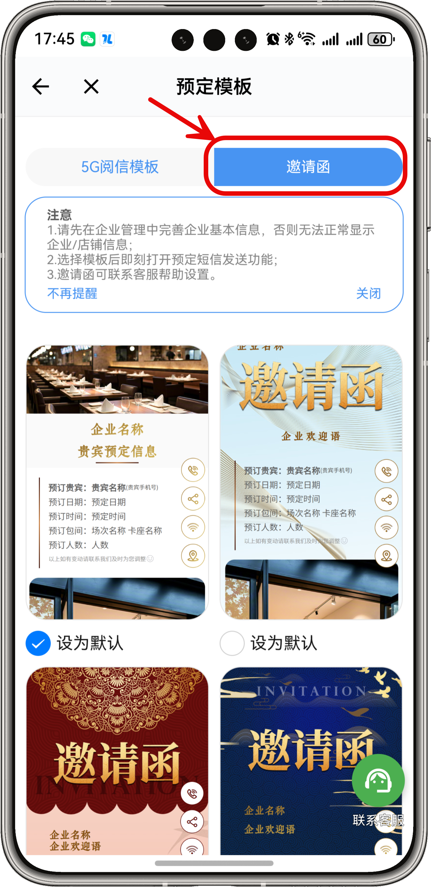 点击可以预览邀请函样式,确认后点击 设为默认 即可。