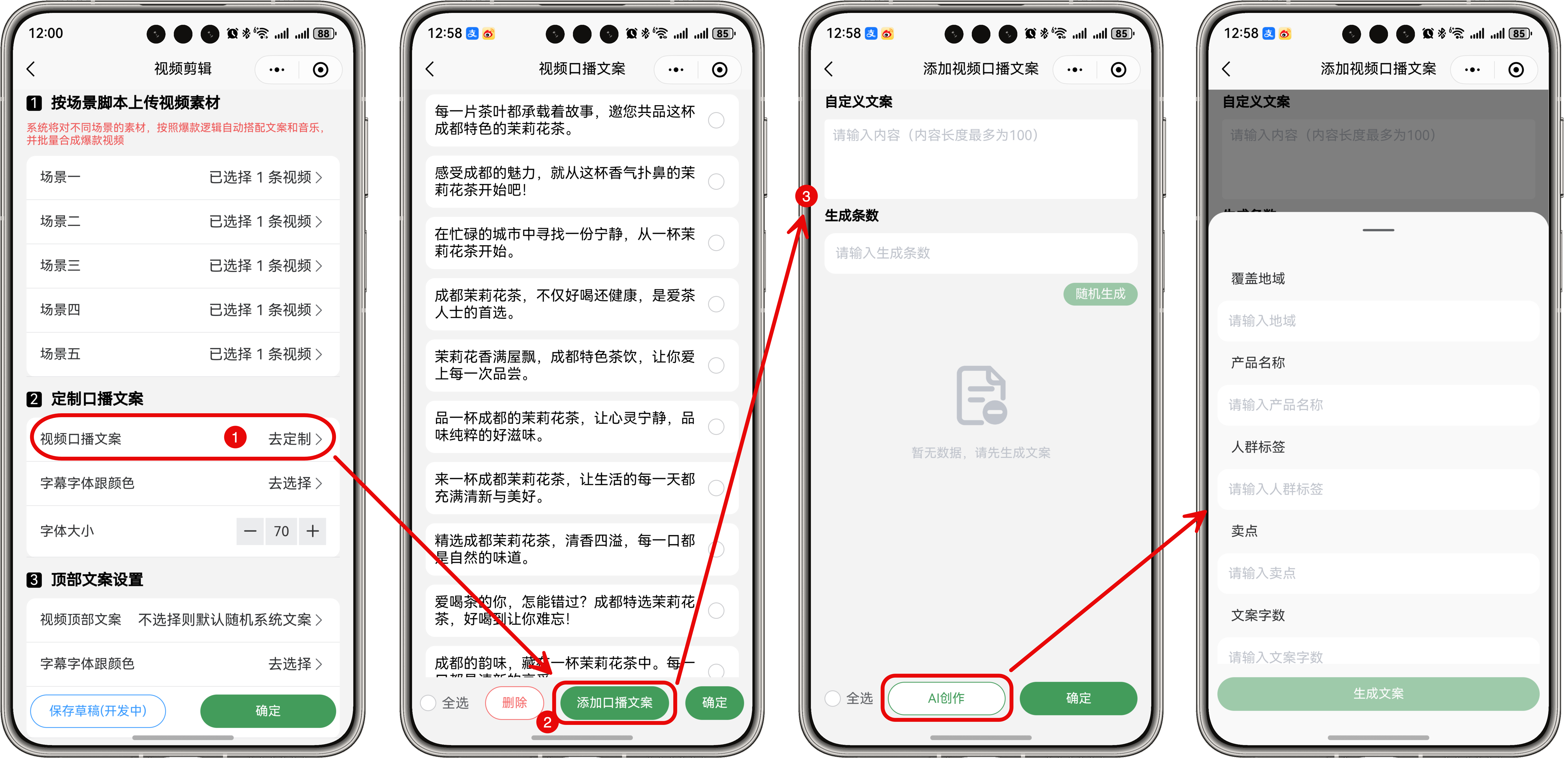 去定制-> 点击添加口播文案-> 填写自定义文案和生成条数-> 点击随机生成即可,也可以通过 AI 创作 来生成口播文案。建议每次可多生成一些(至少不少于生成的视频数量),同时全部选择使用,生成视频时会随机调用,避免文案重复。