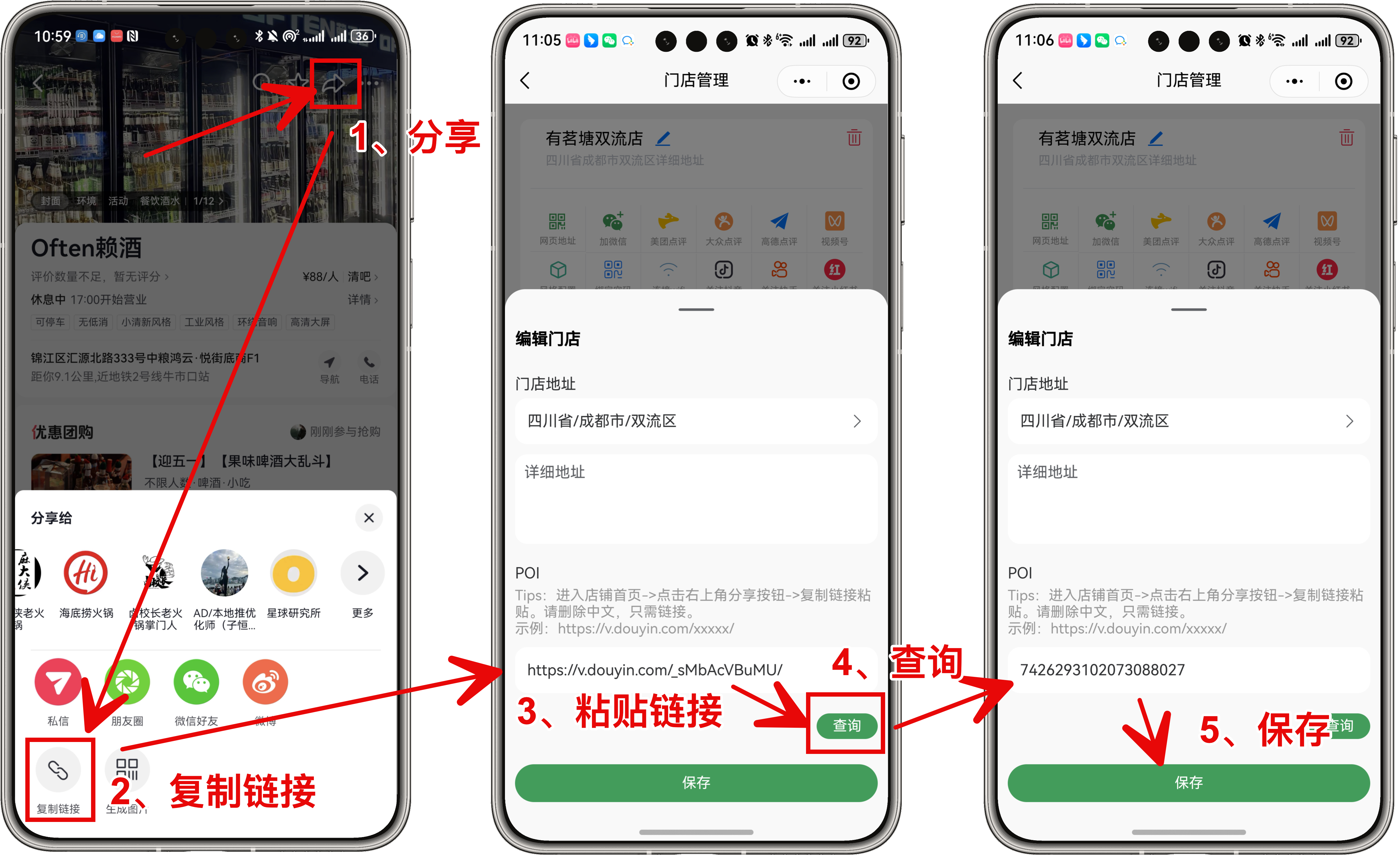 注意粘贴链接时删除掉链接前边的中文以及后边无用的字符串。 如果遇到查询不到POI的情况,请将链接粘贴到其它地方(如微信聊天或者备忘录等),删除无用的文字和字符串,再单独复制链接到小程序中查询